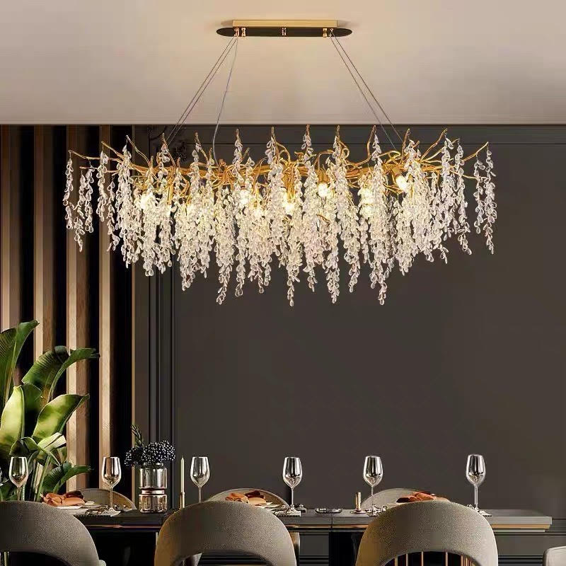 LENZA is a showstopping crystal chandelier that merges organic artistry with modern luxury. Featuring flowing clusters of premium K9 crystals set against a gold-plated aluminum frame, this piece brings a sense of movement and brilliance to any space. Ideal for dining rooms, living areas, entryways, or upscale hospitality settings, LENZA is more than lighting, it’s a glowing sculpture that transforms interiors with radiant sophistication.